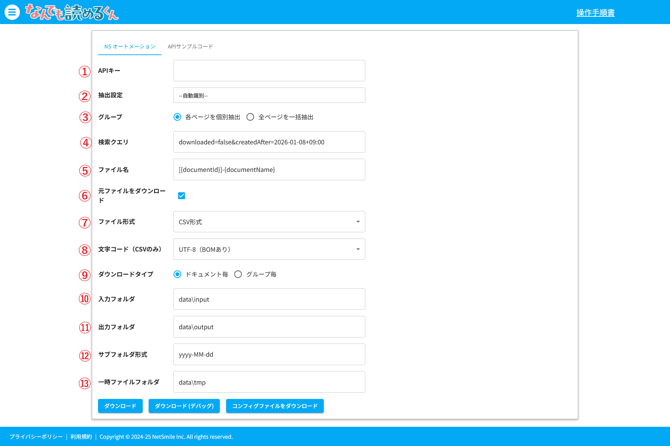 ⑫サブフォルダ形式:出力ファイル格納時にダウンロード日時のフォルダを作成可能です。