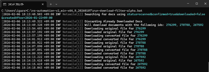 3:コマンドプロンプト上に「run-download-filter-alpha.bat」をドラッグし実行