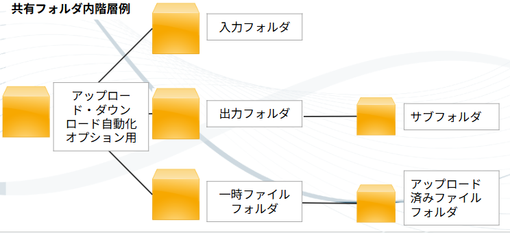 アップロード・ダウンロード自動化オプションの設定を行うために、下記フォルダの作成が必要となります。
