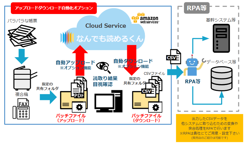 帳票のアップロードや読取結果のダウンロードを自動で行えます。